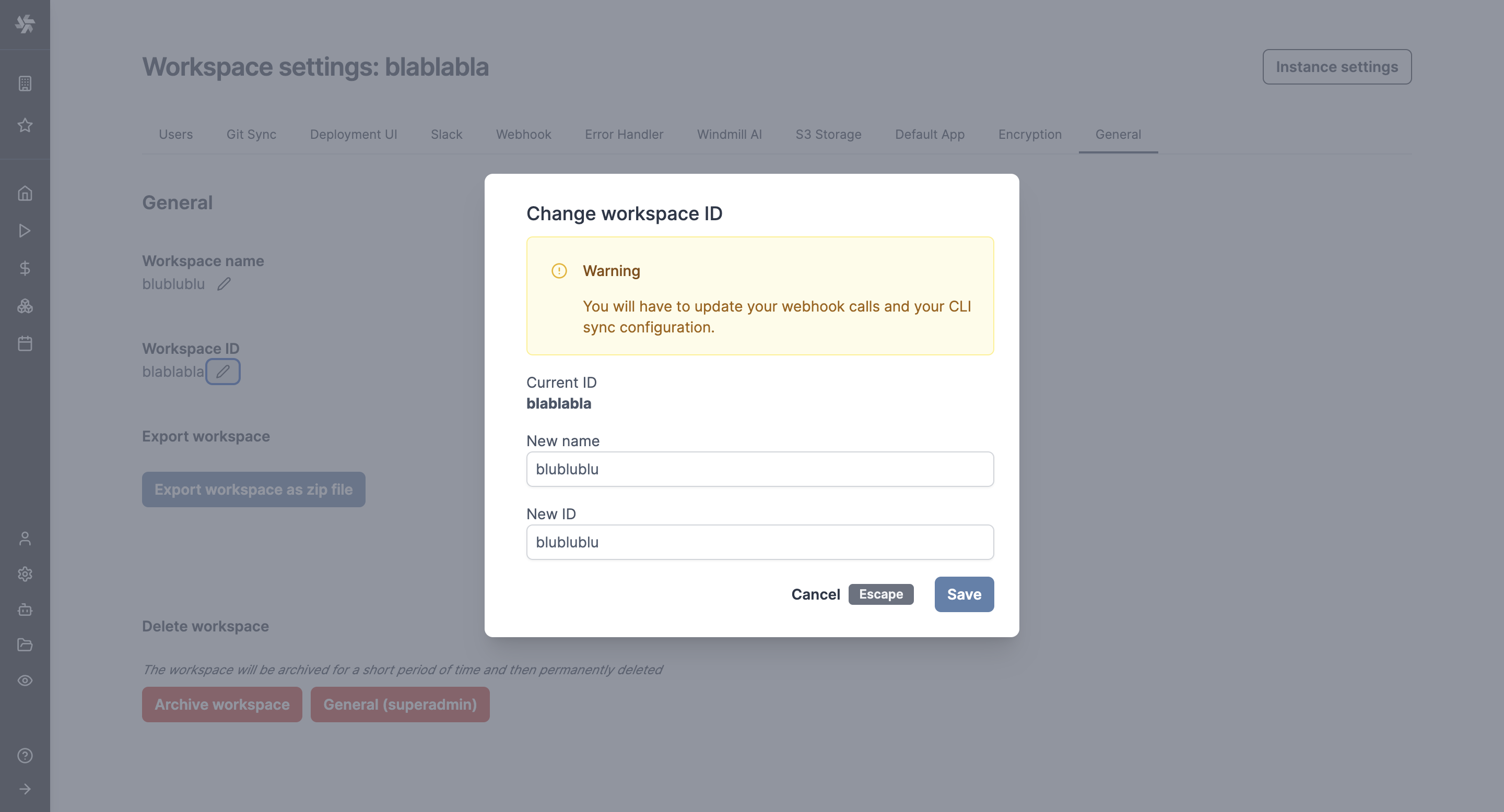 On self-hosted instances, workspaces can have names and IDs updated from the workspace settings.