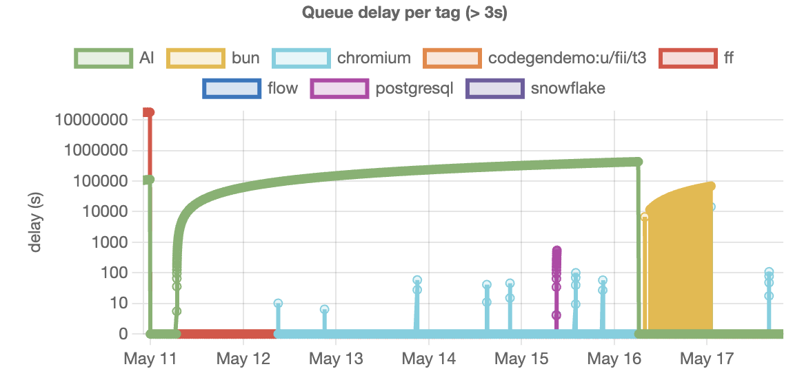 First action we took was to extract the logs from the queue table to a separate table. That was to avoid update unrelated to logs creating dead tuples. Second action was to make the streaming rate from the worker adaptive to the duration of the job, a longer job does not need to update its log every 500ms, every 2.5s is reasonable for jobs of more than 10s, 5s for 60s+, etc...